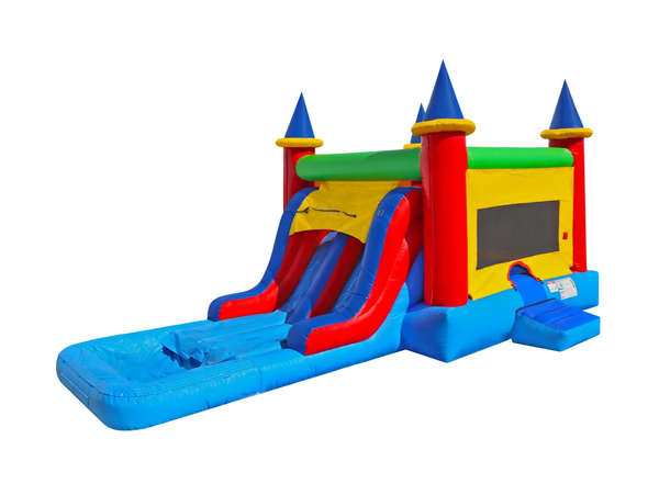 Includes: Bigger bouncing area, dual slide, misting system and pool. Impact mats, tarp, and caution cones.