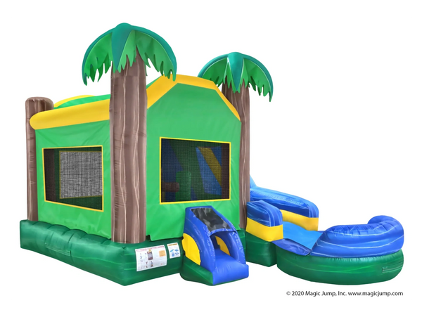Includes: Bigger bouncing area, basketball hoop, inflated push-through, obstacle pop- ups, a wall climber and a high platform wet slide. Also includes impact mats, tarp, and caution cones.